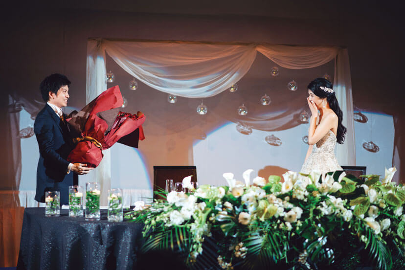 思いがけない新郎からのサプライズに驚きと涙が溢れる新婦。花束を受け取った瞬間に、100本のバラの重みにびっくりしたのだそう。新郎からはふたりで結婚式を創り上げることができたことへの感謝の想いが語られ、その想いにうれしさがこみ上げた