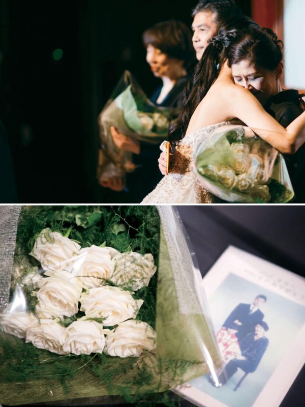 両親への感謝の気持ちが溢れた瞬間。記念品として、小さい頃から今までの写真と、前撮り写真を使ったアルバムを贈った