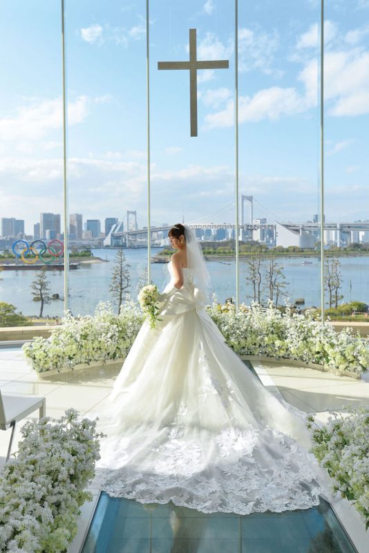 新婦入場前にチャペル内を真っ暗にして、水中の映像を投影。カーテンが上がると同時に、お父様と腕を組む新婦と、夕陽に染まる東京湾がゲストの前に。演出の余韻に浸りながら、お母様から感動のベールダウンセレモニー
