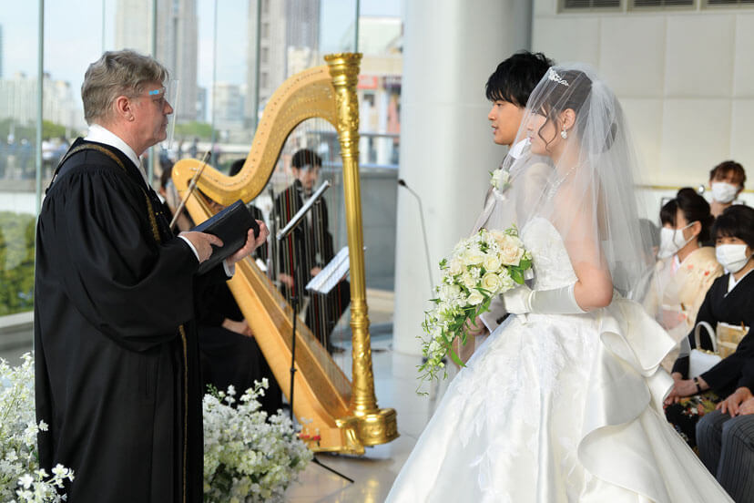 正しい立ち居振る舞いができるかというふたりの不安と緊張も束の間、穏やかな雰囲気に包まれながらの挙式となった