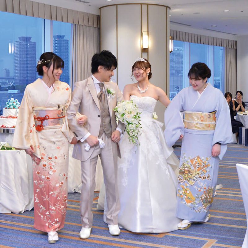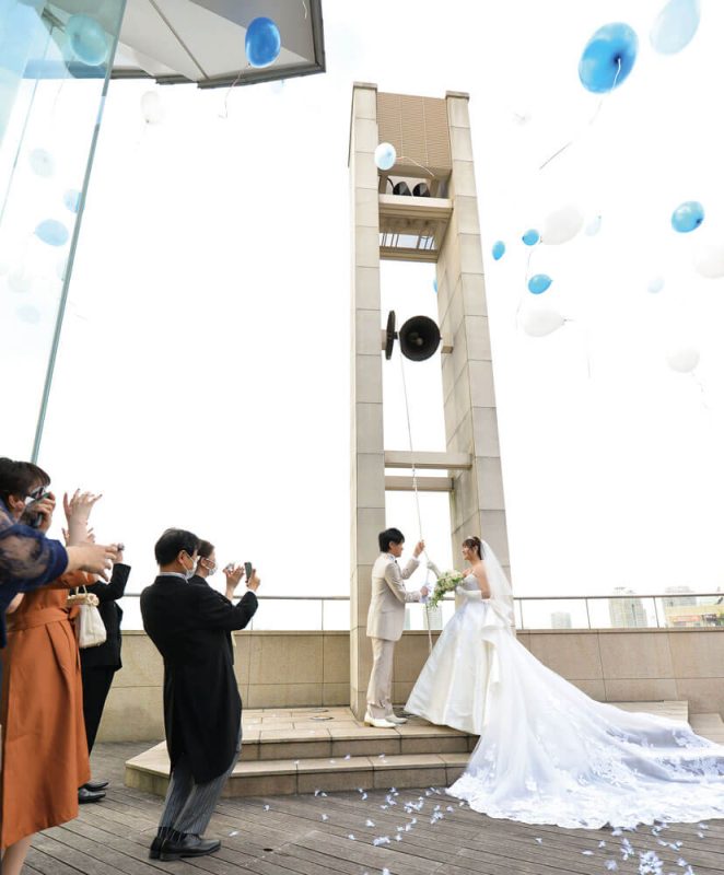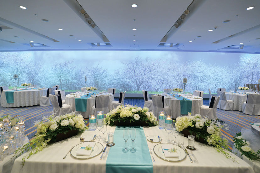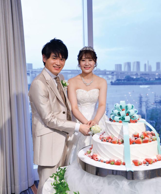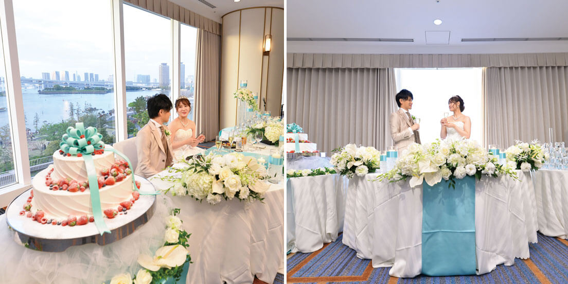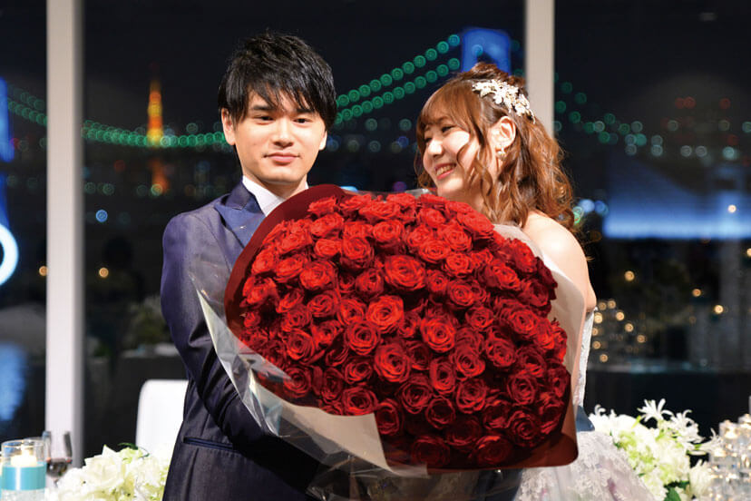 お台場のロマンティックな夕景をゲストや家族に楽しんでもらえるよう、あえて挙式の時間を夕方に設定したふたり。新婦入場前に新郎が待機する間は、チャペルを暗くし水中の映像を投影。カーテンが上がると眼前には東京湾が広がるサプライズを、変わりゆく夕暮れ時の景色と共に楽しんだ。アフターセレモニーの後は、「海」と「ティファニーブルー」をテーマにコーディネートした爽やかな雰囲気の会場で、笑顔溢れる時間を過ごした。ふたりの一番のこだわりは、景観を楽しんでもらうこと。そして、映像演出とBGM。桜や虹、星空の映像演出や、ゲストに馴染み深い曲をセレクトするなど工夫をした結果、ゲストからも「あの曲だ!」と盛り上がってもらえ大満足のパーティに。締めくくりは新郎から、99本の薔薇の花束でのサプライズプロポーズ。「新郎から贈られた薔薇の花束は、押し花として生涯大切にします」と笑顔で語った新婦。新郎の優しさと愛情がしっかりと新婦に伝わり、サプライズと笑顔に満ちた幸せな結婚式となった。