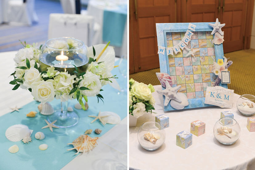 ウエルカムアイテムや卓上装飾は「海」をイメージ。貝殻などをあしらって爽やかな印象に