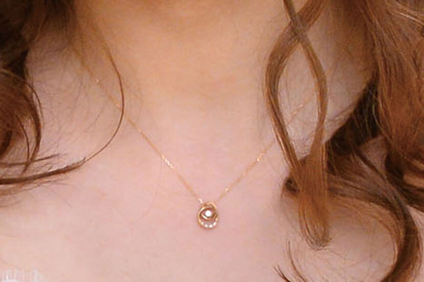 お色直しのカラードレスには、交際3年目の記念に新郎からプレゼントされた思い出のネックレスを合わせた