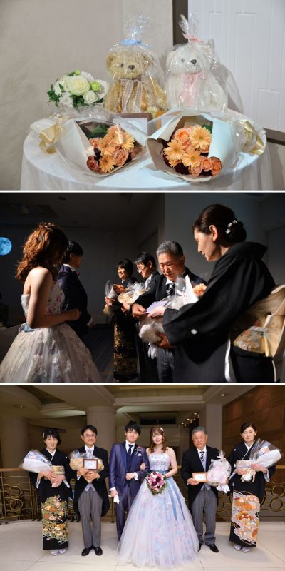 お互いの両親へウエイトベアと花束を贈呈。「いつまでも娘だからね」という母からの言葉に思わず涙がこみあげる新婦。サプライズで似顔絵もプレゼント。想定外の出来事に驚きながらも喜んでもらえた