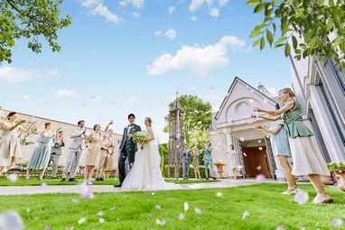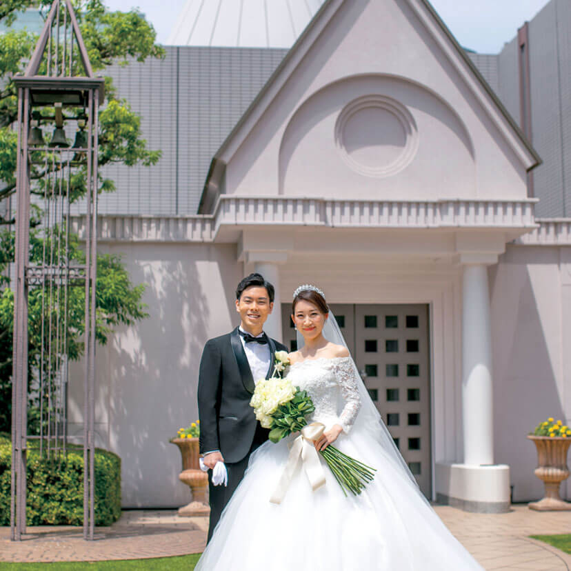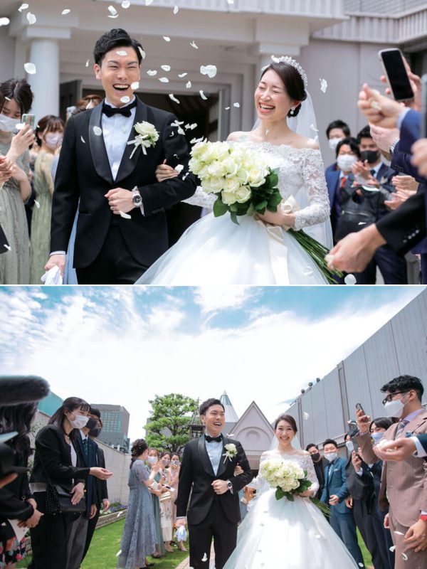 式後はゲストからフラワーシャワーによる祝福をたっぷりと受け、緊張が解けたふたりの笑顔も最高に。チャペルの雰囲気に合うよう、上質なレースのオフショルダーが印象的なプリンセスラインのオーダードレスをまとい、王道のシニヨンとティアラでスタイリング。ホワイトローズを使った茎の長いクラッチブーケがエレガント
