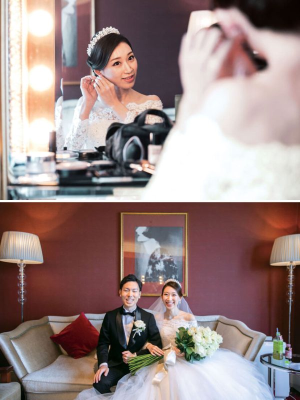 ふたりが泊まるスイートルームでお支度。華やかなハリウッドミラーの前でゆったりヘアメイクを整え、リラックスした雰囲気から1日が始まる