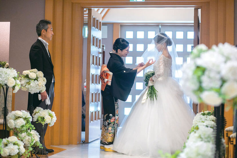 独立型チャペルでのキリスト教式。新婦母によるベールダウン。バイオリンの生演奏、聖歌隊の歌声が響き渡るチャペルが感動に包まれた