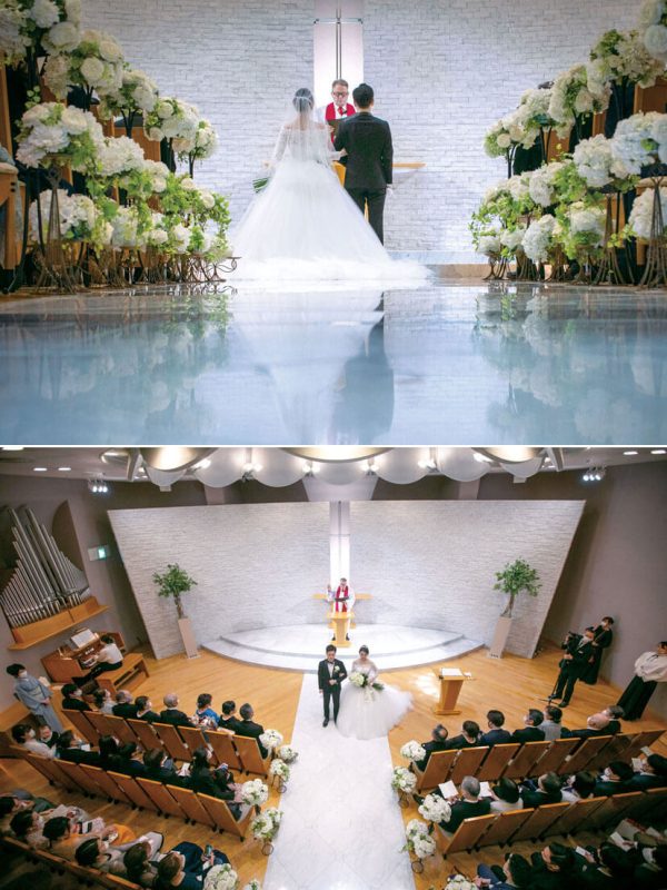 真っ白な大理石に映るふたりの姿が幻想的なシーン。天窓から差し込む光と、ふたりを囲むように配された椅子から見守る参列者のまなざしに胸がいっぱいに。指輪交換の際、指輪がなかなか入らない新郎に笑いが起こりアットホームな雰囲気も生まれた