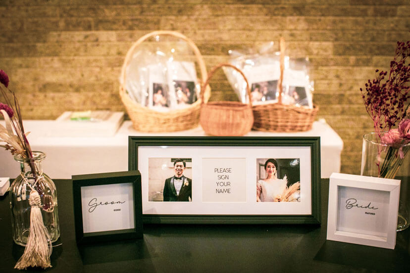 ウエルカムスペースには前撮り写真をメインに、ナチュラルテイストなフォトフレームやドライフラワー、テーブルクロスをセレクト。手作りしたプロフィールブックとコロナ感染予防グッズをコンパクトにまとめ配置