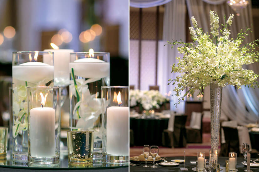 会場の装飾は「クラシカルでエレガントかつ上品な明るさ」というコンセプトで、花材や花器、クロスを選び、暗転しても映えるよう、各卓にキャンドルをたくさん揃えた