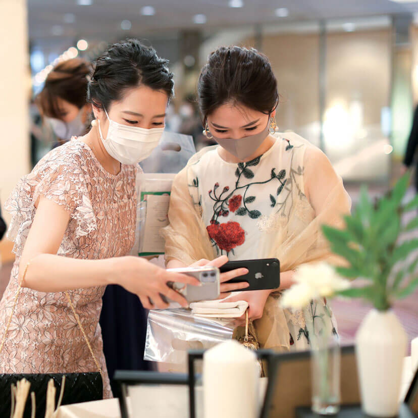 直前の欠席にも対応できるよう席次表はweb上で作成しQRコードを読み込んでもらった。「新郎新婦クイズ」もQRコードでフォームを読み込み回答してもらうかたちをとり、披露宴中に高得点ゲストにプレゼントを渡した