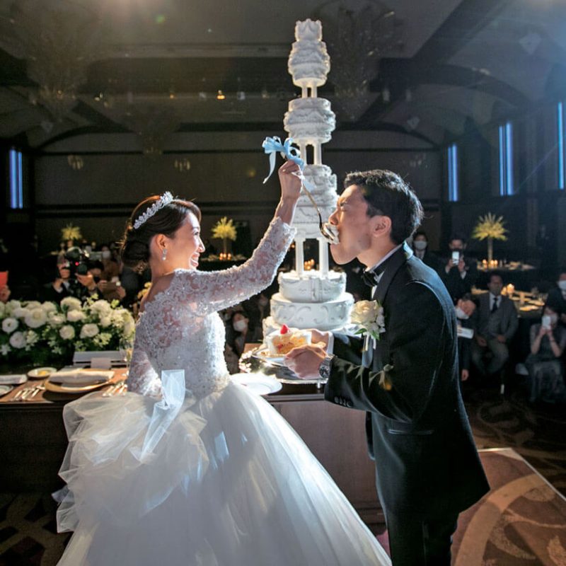 ケーキ入刀からファーストバイト。新郎は大きな一口をしっかり受け止めた