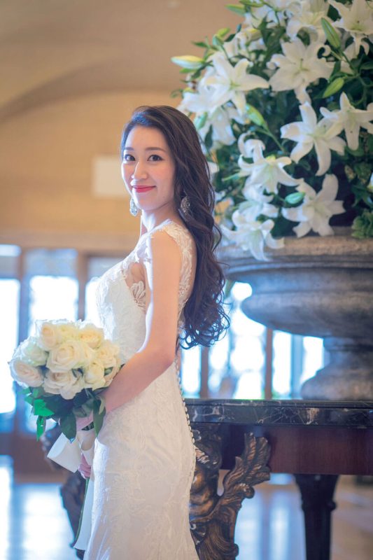 柔らかなボタニカルレースがお気に入りのマーメイドドレス。結婚式後にはホテル内のフォトスポットでの撮影も楽しめた