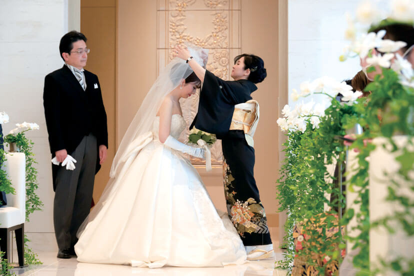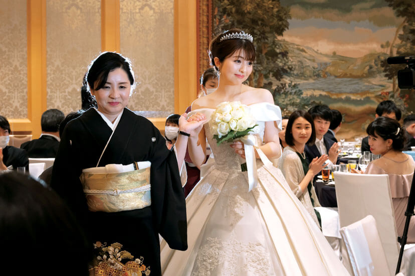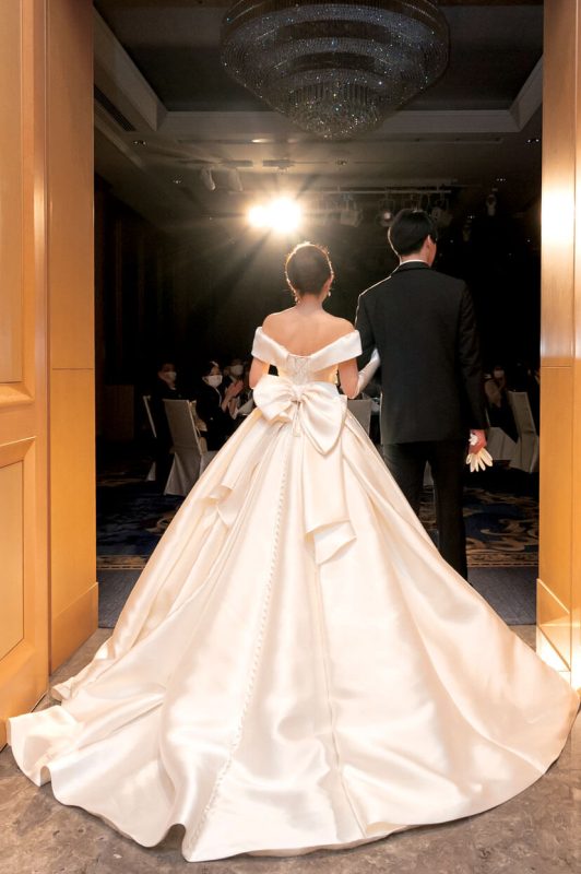 大きなプリンセスラインのドレスは幼い頃夢見た花嫁姿。母と試着を重ね、新郎には当日のファーストミートで披露
