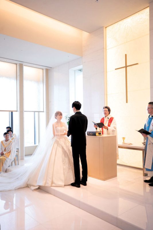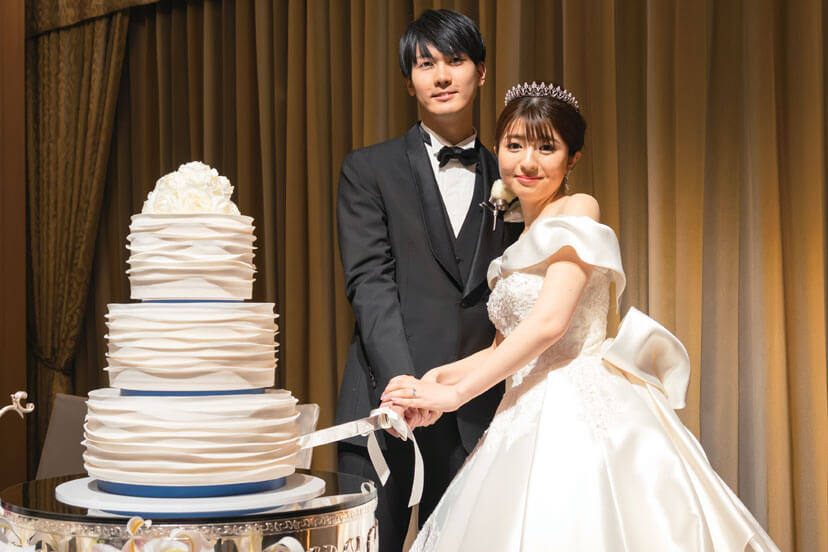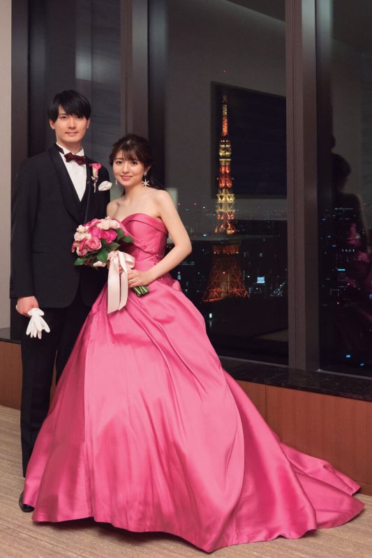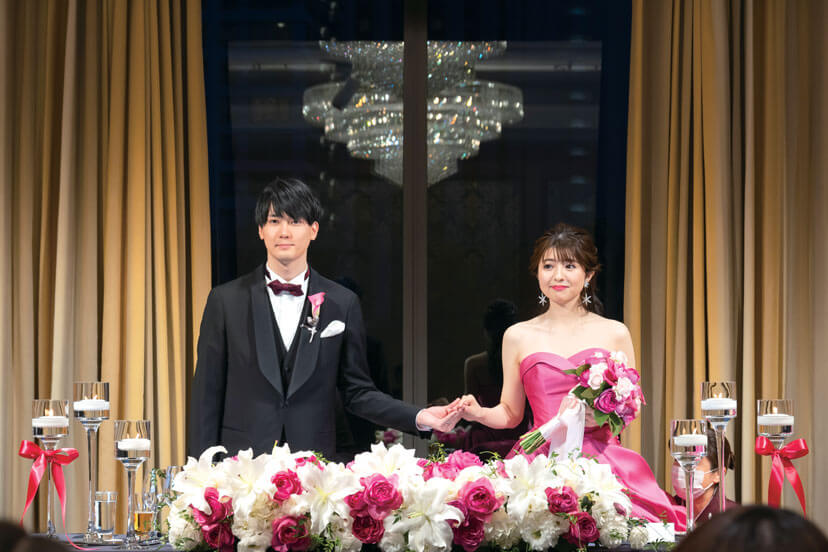 温かな春の陽光に照らされた快晴の日、ホテル41階のスカイチャペルで永遠の愛を誓った。バージンロードへ向かう直前、父が小声で「幸せになってね」と言った時の顔、フラワーシャワーで祝福してくれるゲスト一人ひとりの表情など、幸せの瞬間を今でも鮮明に覚えているそう。披露宴会場は「紺×ピンク×白」をテーマカラーに、華やかなロイヤル感のあるコーディネートに仕上げた。コロナ禍で打合せが難しかったこともあり、余興に代え、テーブルインタビュー方式で、ゲストから新郎新婦とのエピソードやお祝いコメン