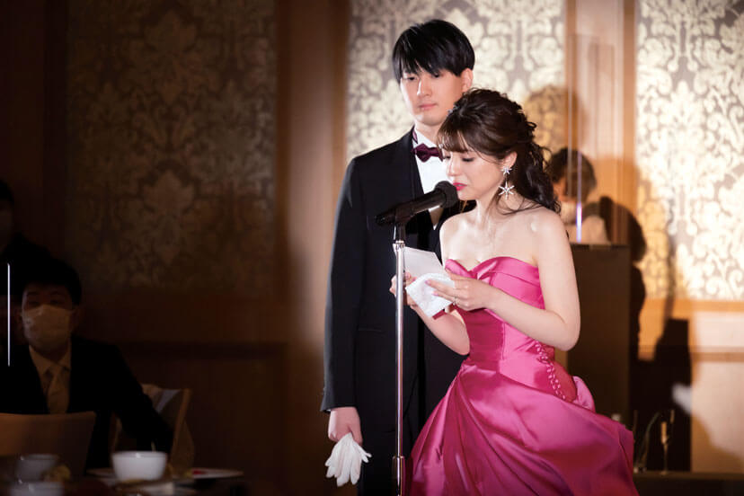 トを披露してもらった。懐かしい思い出話や賛辞はふたりの人生への応援メッセージとなり一生の宝物に。新婦がどうしても伝えたかった両親への感謝の気持ちは手紙に寄せて朗読した。ゲストからも「親孝行したくなった」との感想をもらい、また、いまだに式当日の写真を眺め嬉しそうにする両親の姿を見て、結婚式をして本当に良かったと感じているそう。「はじめての共同作業を重ねて作り上げた結婚式で絆が深まりました」とふたり。