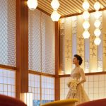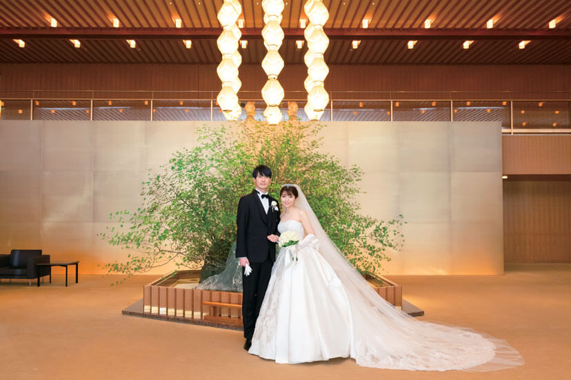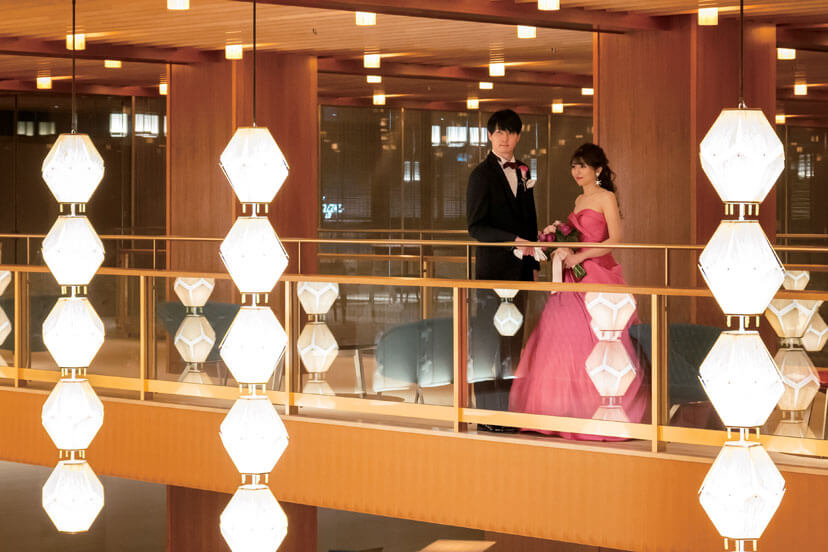 存在感のある美しいデザインの照明「オークラ・ランターン」がふたりの佇む姿を幻想的に映す
