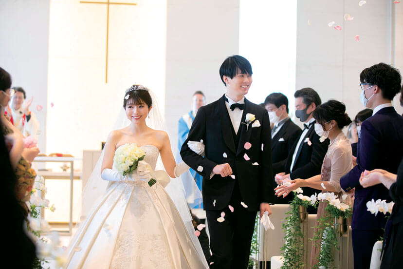 ゲストから「ふたりがとても明るく幸せそうで、花びらを投げるこちらも幸せな気分になった」と好評だったフラワーシャワー