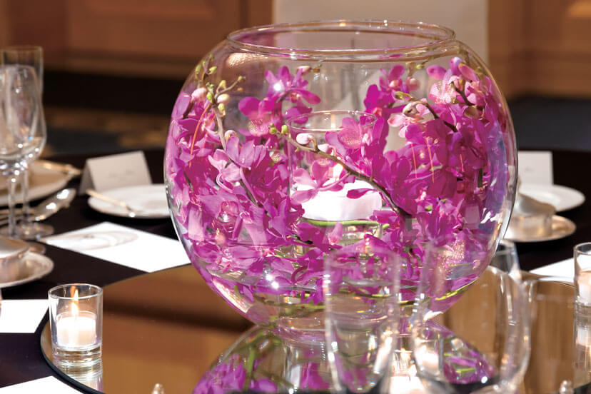 紺のクロス×ピンクの装花でロイヤルな華やかさを表現
