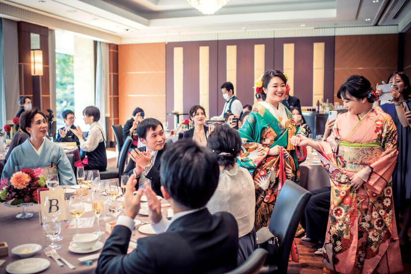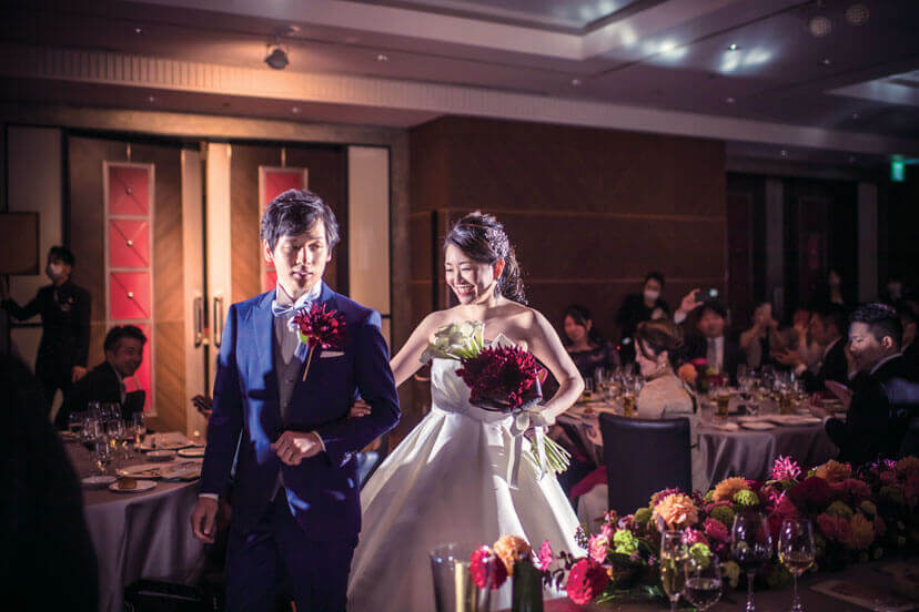 コロナの影響で仕事関係のゲストを招待できなかったが、両家親族と親しい友人を招いたアットホームな結婚式を実現したふたり。挙式は館内の「幸福殿」で、憧れの白無垢姿で厳かな神前式を。披露宴は色打掛に掛け替えて、鏡開きで祝杯。おもてなしのフランス料理は美味しかったと大好評だった。余興ができない分、映像演出の制作に時間をかけた新郎。都内でビデオ撮影をしたり、たくさんの懐かしい写真を集めて自作したプロフィールムービーはプロ顔負けのクオリティだったと評判に。また、大学時代のサークルの友人・先輩たちからサプライズのビデオメッセージが贈られ、多くの人たちに祝福されてこの日を迎えられた幸せに感激した。「コロナ禍の結婚式だからこそ、当たり前のことが当たり前でないことに気づけました」という新婦。当日まで久しく会えなかった人たちも多く、披露宴会場に一堂に会したゲストの笑顔を見た瞬間、「結婚式をして本当によかった!」と、この上ない喜びと、感謝の気持ちでいっぱいに。一生忘れられない至福の一日となった。