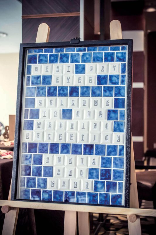 陶芸家の新婦友人が制作してくれたウエルカムボード。スキューバダイビングサークルで出会ったふたりをイメージして海の色のタイルで表現
