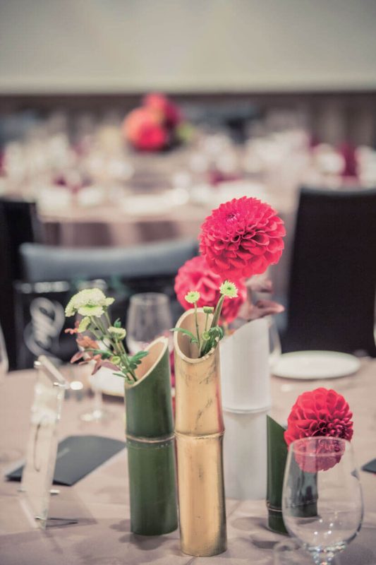 和装や鏡開き演出など、和のテーマに合わせて和風にした会場装花。色打掛に合わせた色とりどりの花を、新郎の要望で竹筒の花器に飾ってもらった