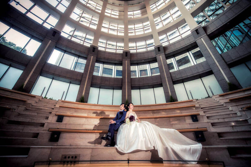 アトリウムチャペルの階段に光沢感のあるミカドシルクのウエディングドレスのトレーンを広げてエレガントに記念撮影