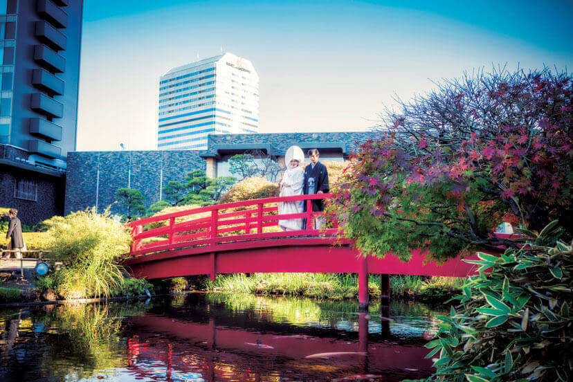 白無垢・色打掛・白ドレスの衣裳で憧れを叶えた新婦。白無垢が映える日本庭園の太鼓橋で、挙式前の記念撮影