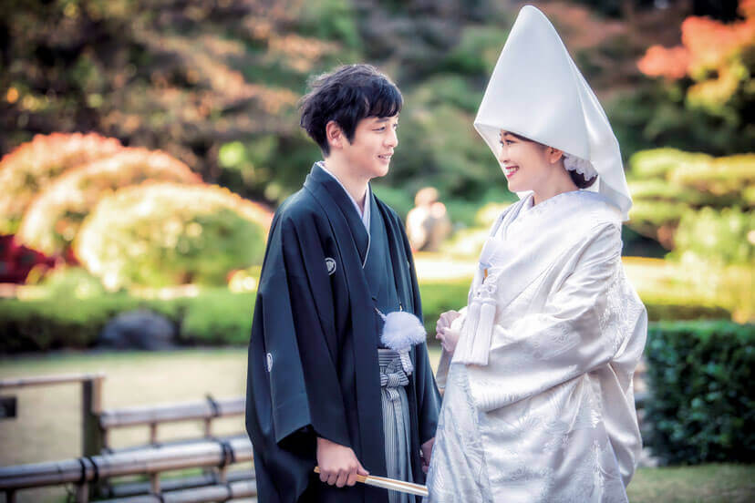 紋服姿の新郎と白無垢・綿帽子姿の新婦。白無垢はショップおすすめの逸品の中から、いちばん刺しゅうの柄がはっきり分かるものをチョイス。日本庭園でも神殿でも、吉祥の柄が浮かび上がり、日本の美を感じさせる記念の写真を残せた