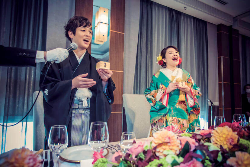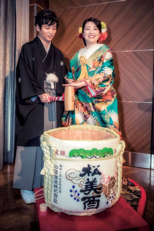 祝宴は威勢のよい鏡開きの掛け声でスタート。樽酒は、新婦の妹の友人が嫁いだ老舗酒造の銘酒の中から試飲して選んだ大吟醸を振る舞った