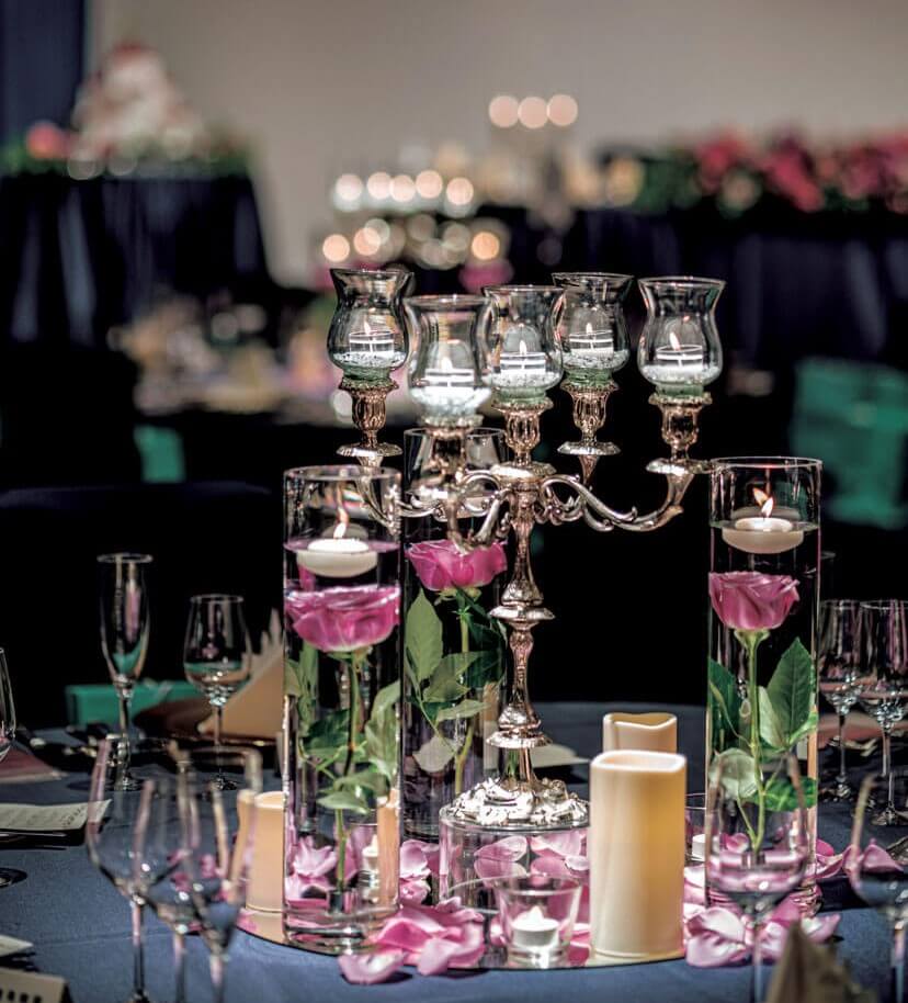 テーマカラーのネイビー×ゴールド×ピンクで統一された会場装飾。一輪挿しのバラと燭台は美女と野獣のお城の食卓をイメージ