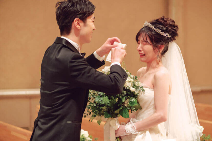 ファーストミートでブーケを差し出しながら「とっても綺麗だよ。結婚して毎日楽しくて幸せで、本当に結婚して良かった」と新郎。その言葉に感動し思わず涙する新婦