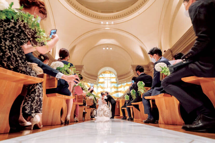 コロナ禍による延期を乗り越え迎えた結婚式当日。ファーストミートで新郎から「結婚して本当に良かった」と言われ、仕上がったばかりのメイクがすっぴん状態になるほど大号泣した新婦。挙式はヨーロッパの教会を思わせるホテル内のチャペルで。マスク越しにもわかる満面の笑みで祝福する友人の姿に感動が込み上げた。コロナ禍の披露宴。参加し