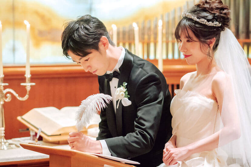 祭壇のイエローオニキスにウエディングドレスが映える神聖な雰囲気のチャペルで、厳かに行われた挙式