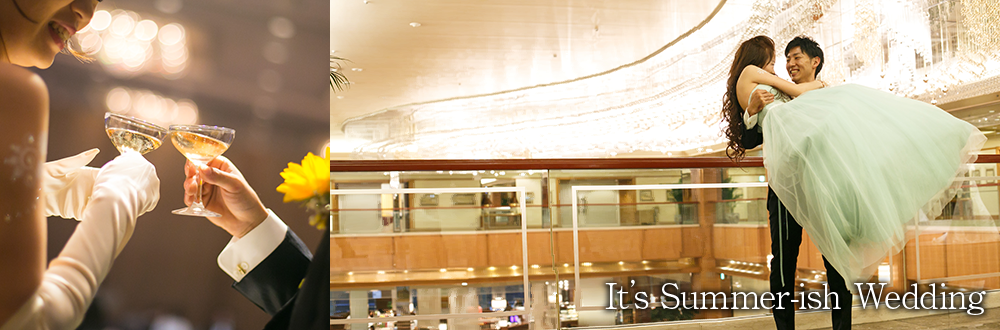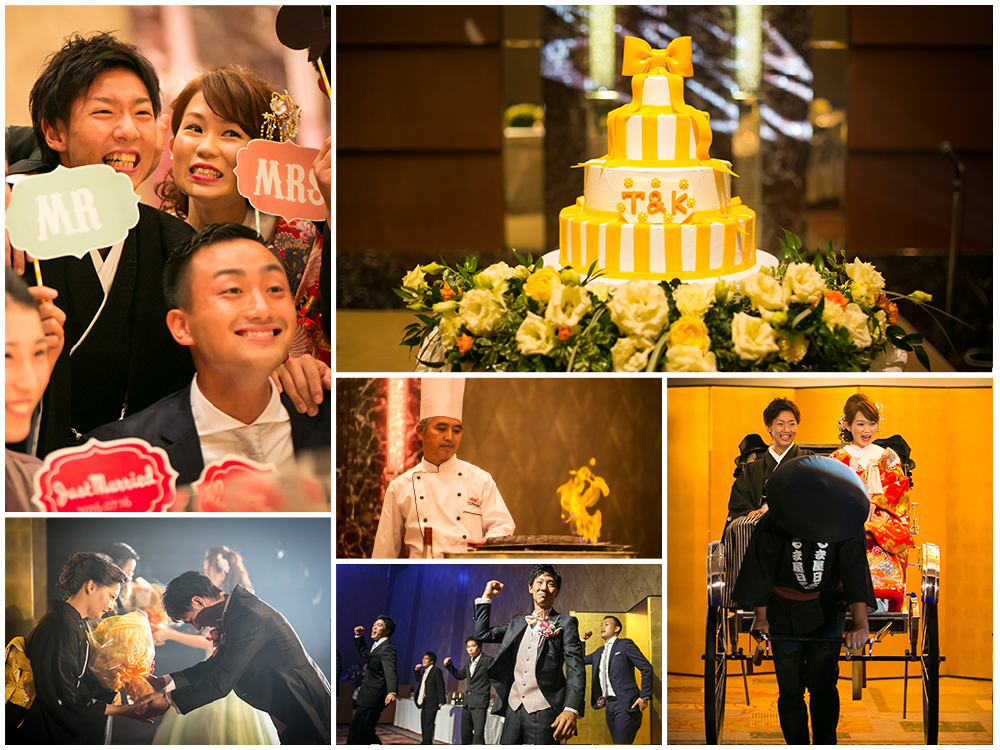 披露宴では、ふたりらしい元気なイメージを表現するため、装花にひまわりを使用。ひまわりには、新郎が初めてプレゼントした花というエピソードがあり、ふたりにとって大切な思い出の花となっているそう。人力車に乗っての再入場、友人や同僚からのサプライズ演出、親御様への手紙と花束の贈呈など、笑いあり、涙ありの生涯忘れられないパーティとなった。