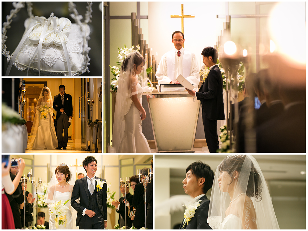 挙式はロイヤルパークホテル4階のチャペルにて。幻想的な光の演出とパイプオルガンやフルートの壮大な音色、百合や薔薇の香りに包まれたチャペルは、純白のドレスとお婆さまの形見であるパールのネックレスに身を包んだ花嫁を、より一層輝かせてくれる。そして、13mのバージンロードをお父様と歩き、新郎の元へ。大切な人たちに見守られながら、ふたりは永遠の愛を誓った。