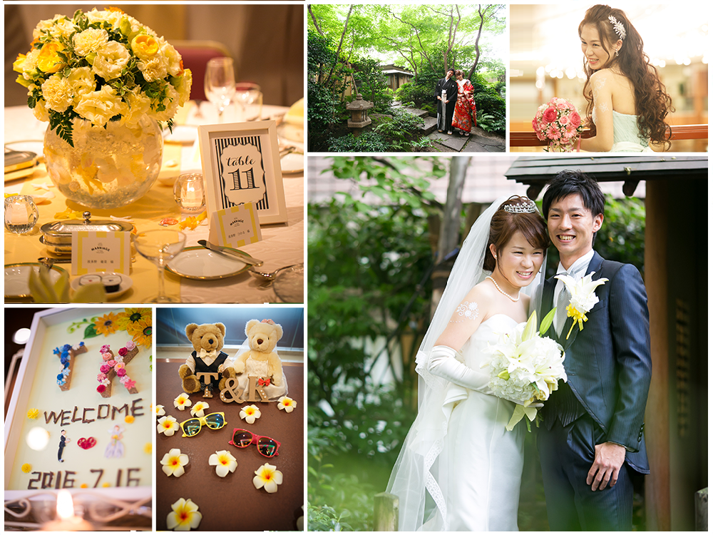 2回のお色直しをした新婦。ウエディングドレス、カラードレス、色打掛はどれもこだわって選んだもの。特に、胸元をハートカットで作ったマーメイドラインのウエディングドレスは、百合の花のブーケとマッチし、花嫁の美しさを引き立てている。黄色をイメージカラーにした装花や夏・海をテーマにしたボーダーの席札など、随所にふたりらしさを感じるアイテムが結婚式を彩った。