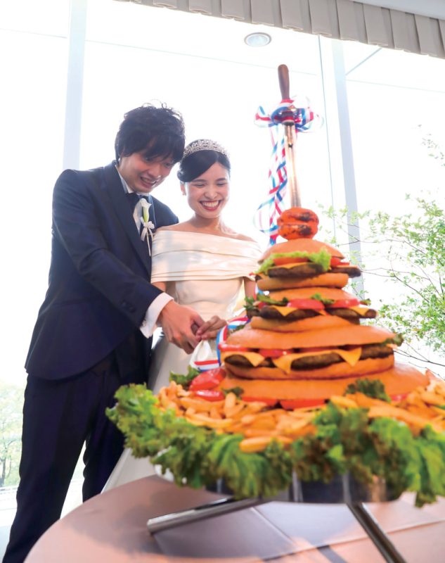 ハンバーガー好きの新郎新婦らしい特大ハンバーガーが登場してのカット&バイト演出は、ゲスト全員が驚いたサプライズ演出に!