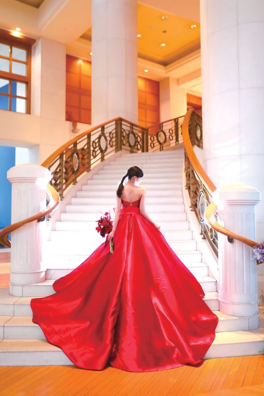 光沢感のあるミカドシルクのカラードレスのスカートを大階段で広げてドラマティックなバックショットを撮影。ヘアは毛先だけふわふわに仕上げたタイトポニーテールに大ぶりのイヤリングを付けて印象的なスタイリングに。
