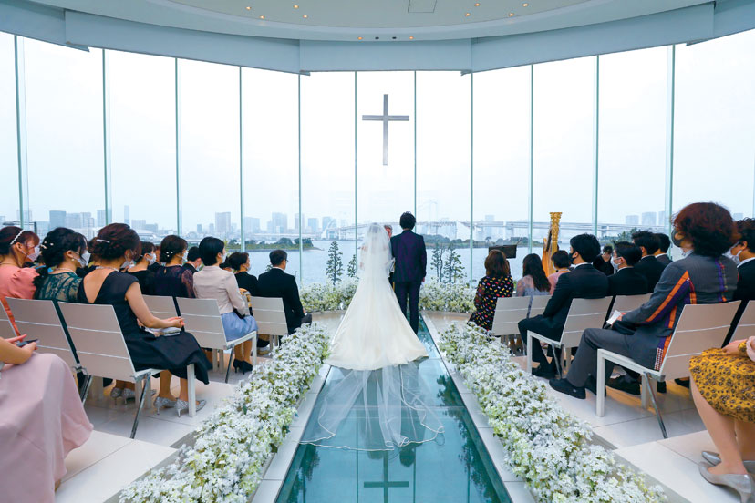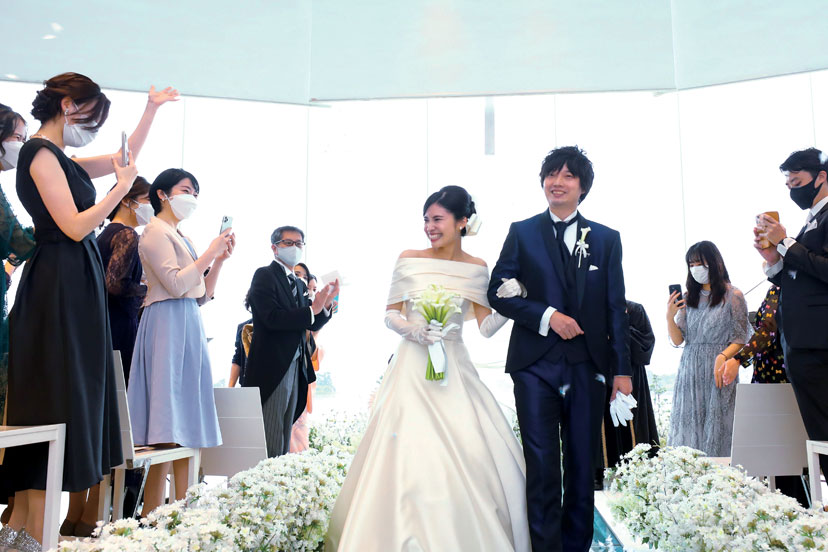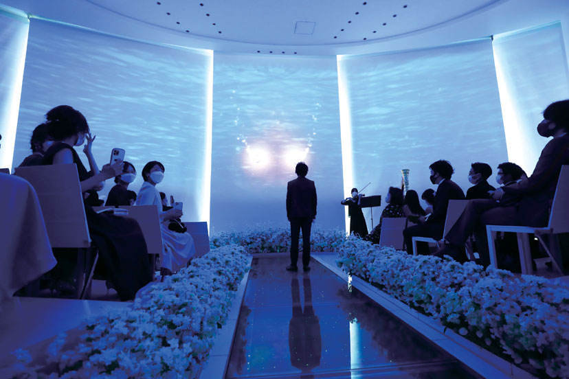 チャペル「ルーチェマーレ」の挙式では、水中をイメージしたオープニング映像からスタート。結婚式に初参列の新婦友人たちは入場シーンですでに感涙していたそう。