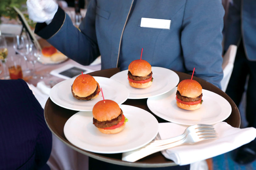 可愛いミニバーガーをサーブされて会場中が笑顔に。小麦アレルギーのゲストのためにシェフが米粉のバンズも用意してくれたので、「久しぶりにハンバーガーを食べられた」と喜んでもらえた。