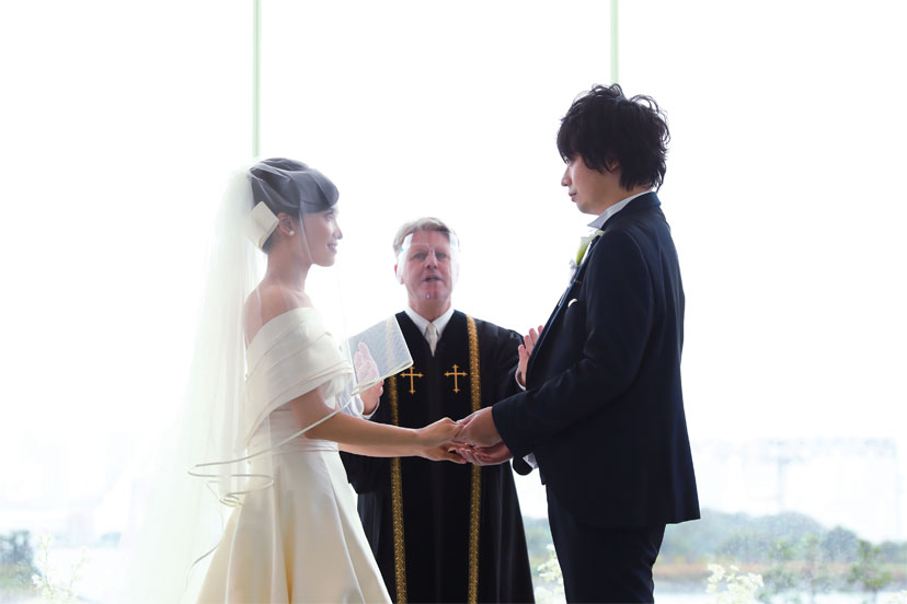 式中はかっこよくスマートに執り行いたいと、前日に式の流れを何度も練習して臨んだふたり。牧師先生のお言葉には思わず涙がじわり。