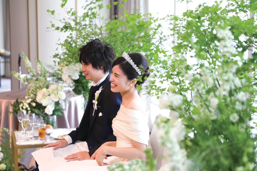 高砂テーブルは置かず外の景色を活かしたグリーンと白のみのフラワーに。ゲストが気軽に高砂へ来れるようにした。