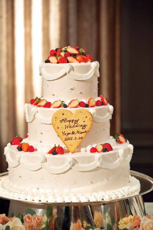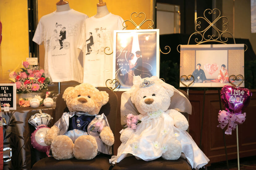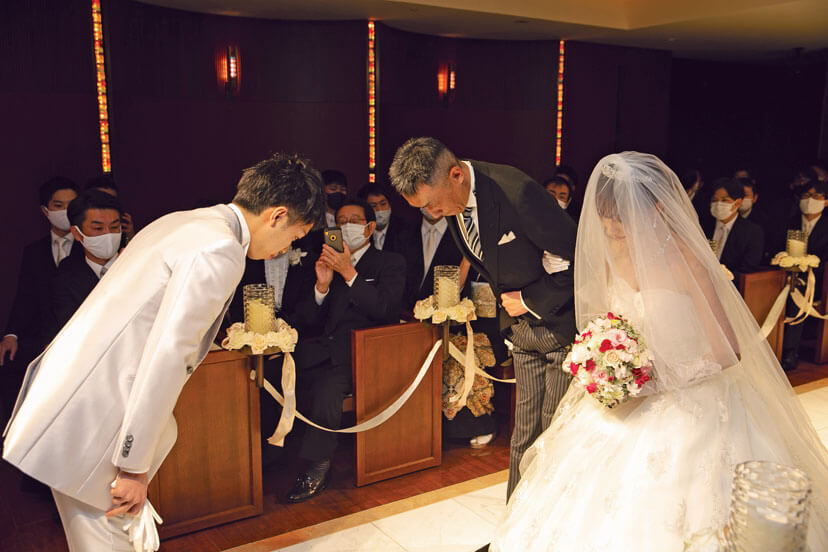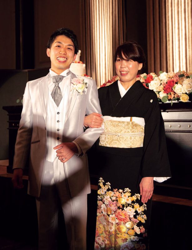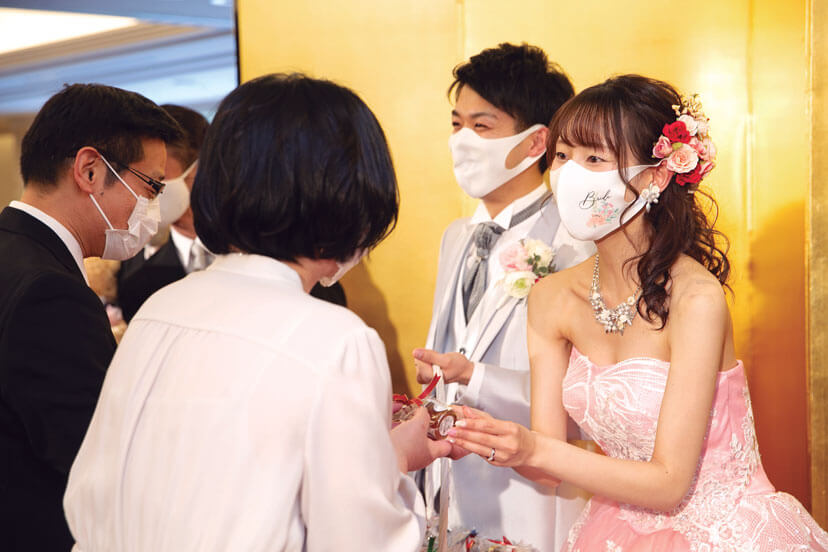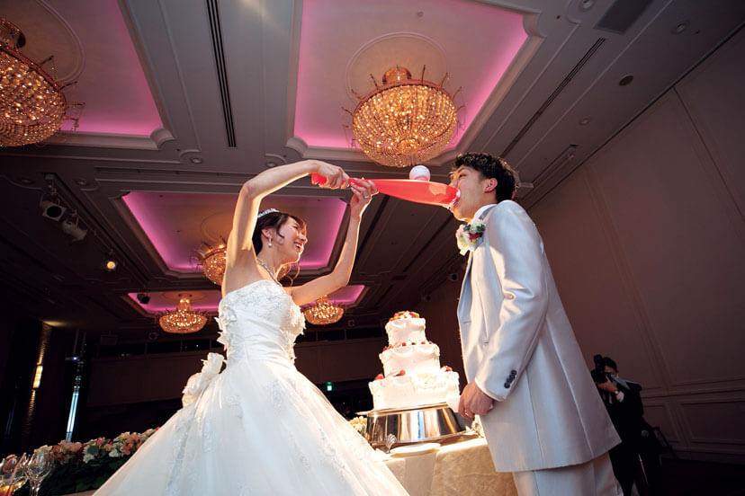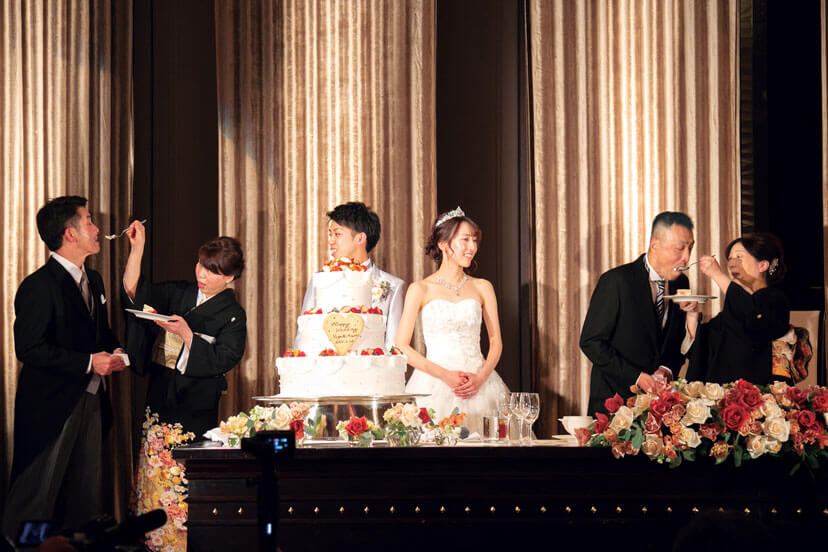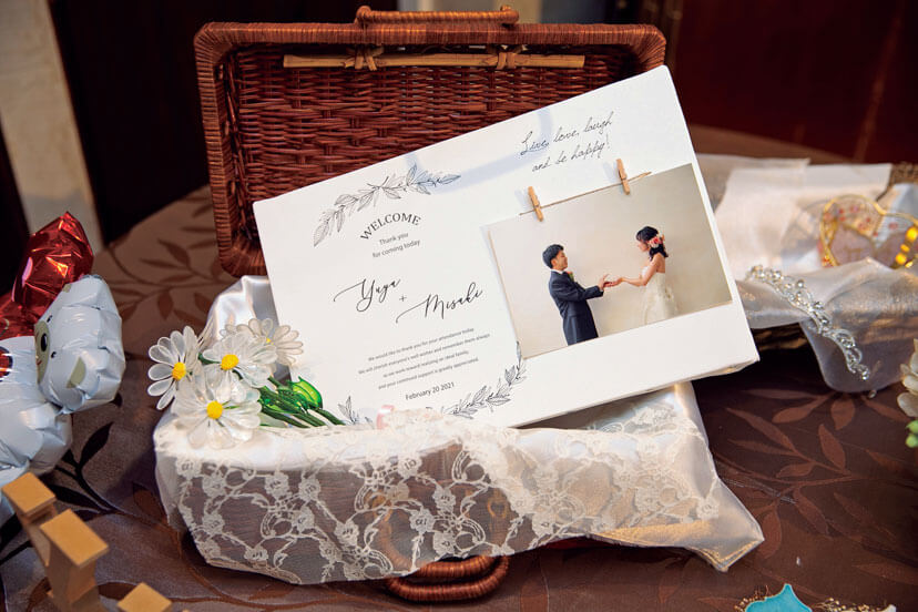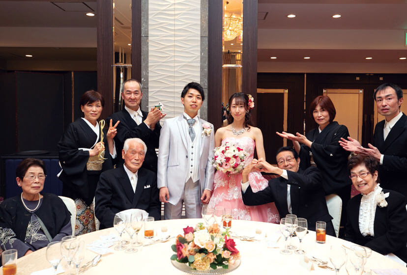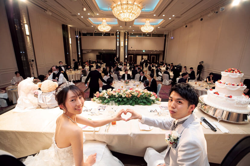 結婚準備をするなかで、一番近くで見てほしい親族の席が遠いことに違和感を感じ、親族に注目が当たるサプライズシーンを設けたり、ゲストが楽しく参加できる演出を取り入れた新郎新婦。近隣ホテルでは最大級という360度のプロジェクションマッピング設備を活かした迫力の音と映像でドラマティックに盛り上げたほか、ウエルカムグッズやプロフィール紹介の冊子·新聞、エスコートカード付き消毒ジェルなどのオリジナルアイテムをたくさん手作りして、ふたりらしさを表現。フォトラウンドで各テーブルを回った際には、ゲスト一人ひとりと会話を交わして感謝の気持ちを伝えることができた。伝統と格式のあるホテルならではの上質なサービスや料理はゲストの皆さんから大好評で、職場の上司や年配の親族に十分なおもてなしをしたいと願っていたふたりの希望通り、満足してもらうことができた。当日撮影した動画は新郎のお気に入りで、新婚旅行中も新居でも何度も再生しているそう。「うれしそうに見入る姿に、結婚式をして本当によかったと感じます」と新婦。
