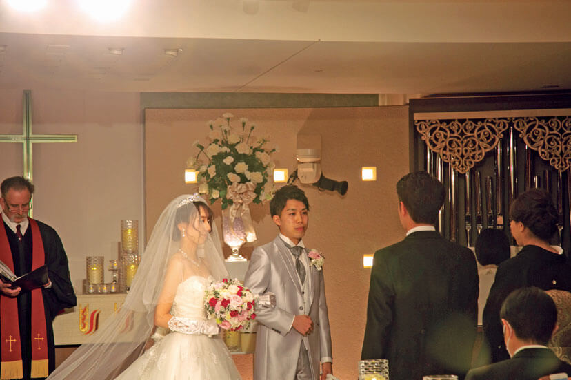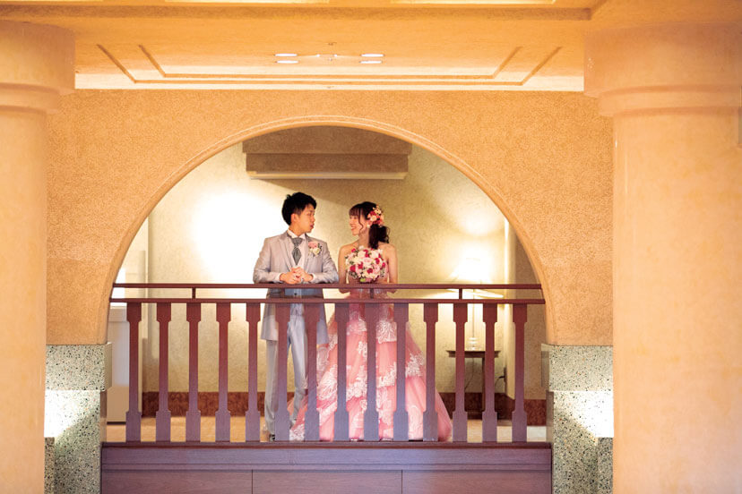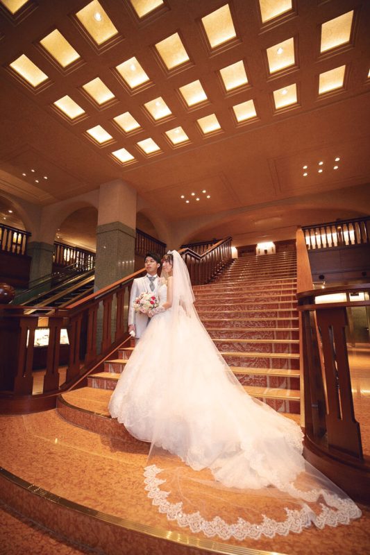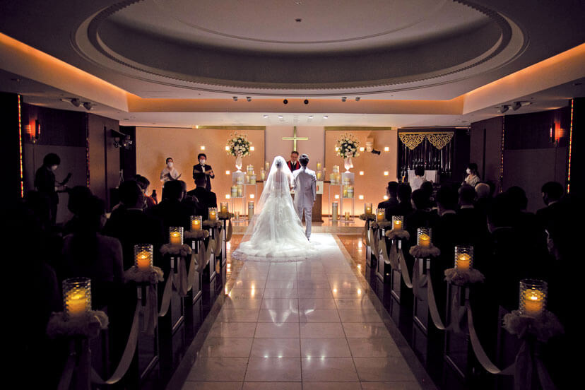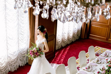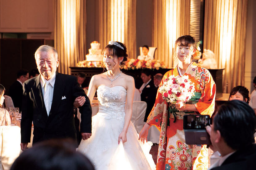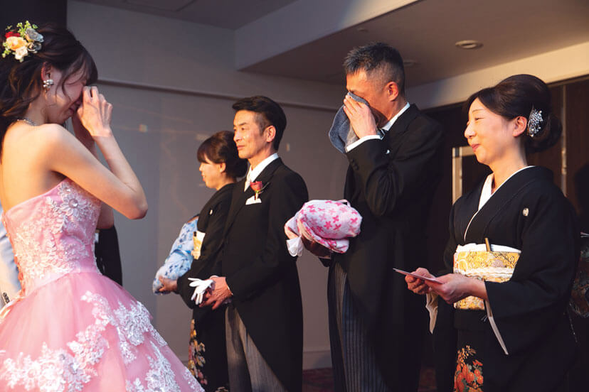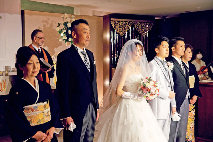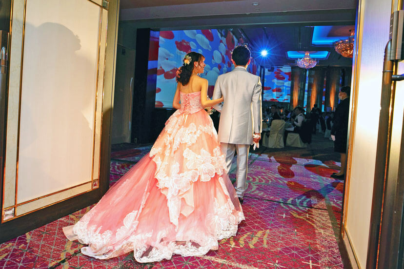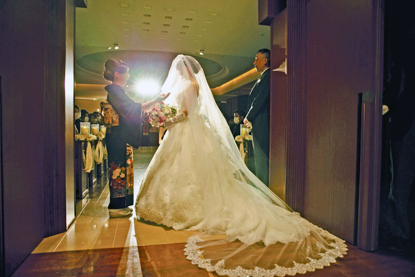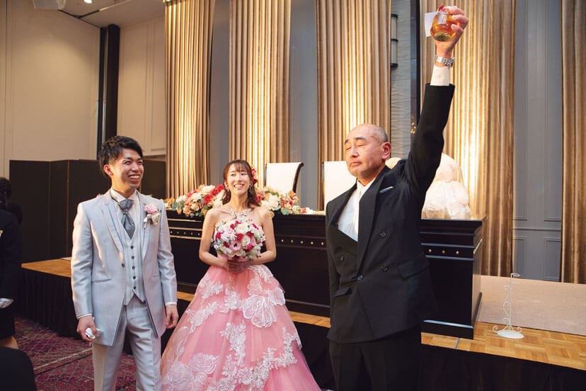 結婚準備をするなかで、一番近くで見てほしい親族の席が遠いことに違和感を感じ、親族に注目が当たるサプライズシーンを設けたり、ゲストが楽しく参加できる演出を取り入れた新郎新婦。近隣ホテルでは最大級という360度のプロジェクションマッピング設備を活かした迫力の音と映像でドラマティックに盛り上げたほか、ウエルカムグッズやプロフィール紹介の冊子·新聞、エスコートカード付き消毒ジェルなどのオリジナルアイテムをたくさん手作りして、ふたりらしさを表現。フォトラウンドで各テーブルを回った際には、ゲスト一人ひとりと会話を交わして感謝の気持ちを伝えることができた。伝統と格式のあるホテルならではの上質なサービスや料理はゲストの皆さんから大好評で、職場の上司や年配の親族に十分なおもてなしをしたいと願っていたふたりの希望通り、満足してもらうことができた。当日撮影した動画は新郎のお気に入りで、新婚旅行中も新居でも何度も再生しているそう。「うれしそうに見入る姿に、結婚式をして本当によかったと感じます」と新婦。