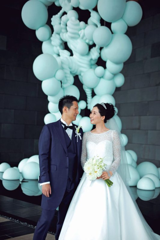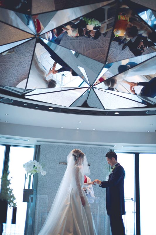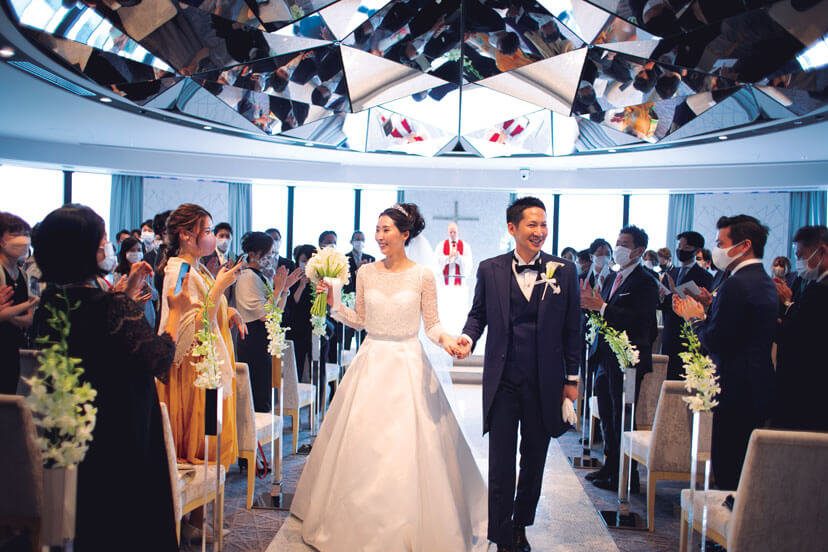 地上200mの高層チャペルは光溢れるアート空間。キリスト教式で永遠の愛を誓った。