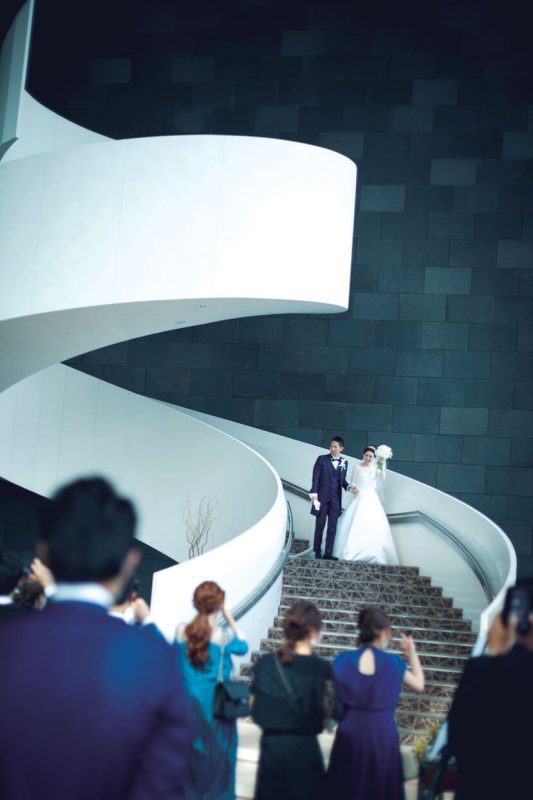 式後はアトリウムロビーのらせん階段から新郎新婦が登場。祝福の拍手で迎えられ、記念撮影タイム。