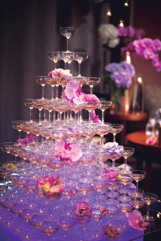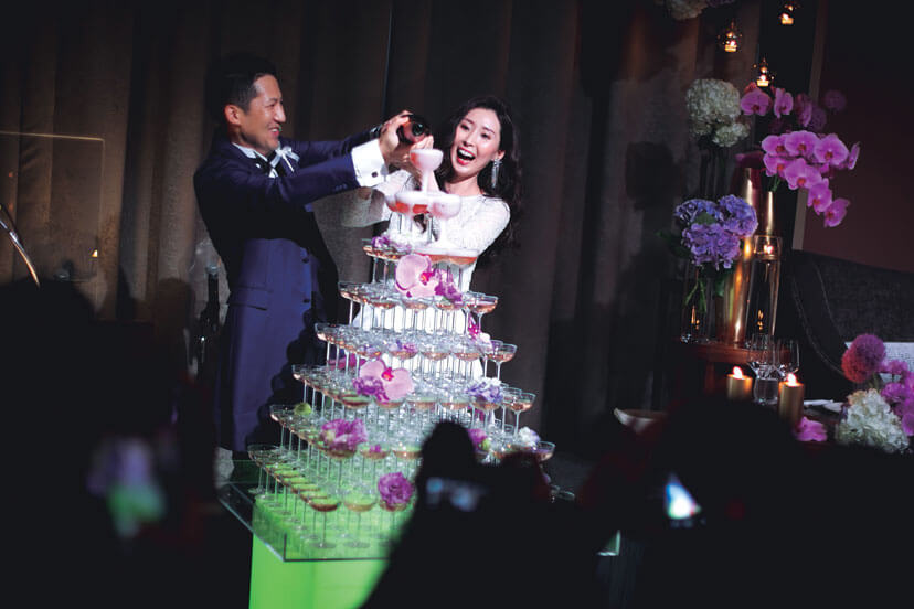 ケーキカットより自分たちらしいと選んだシャンパンタワーセレモニー。