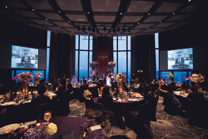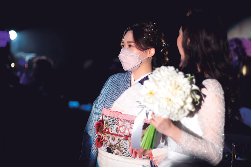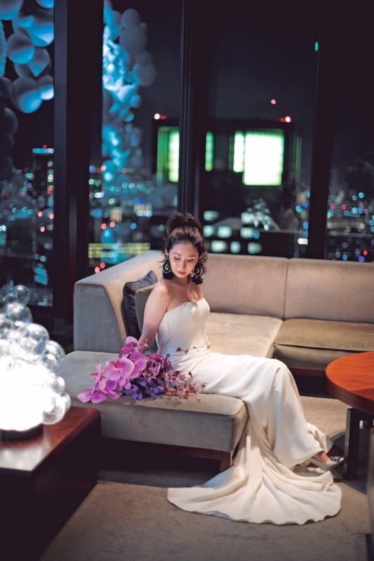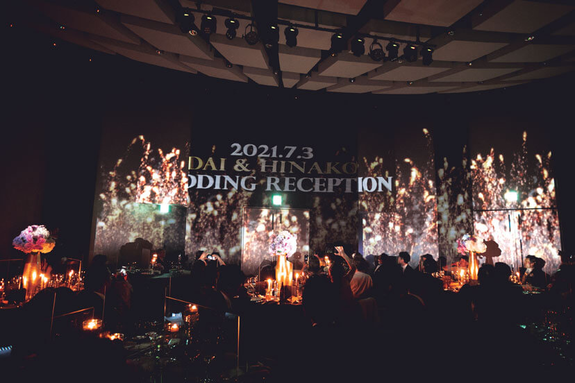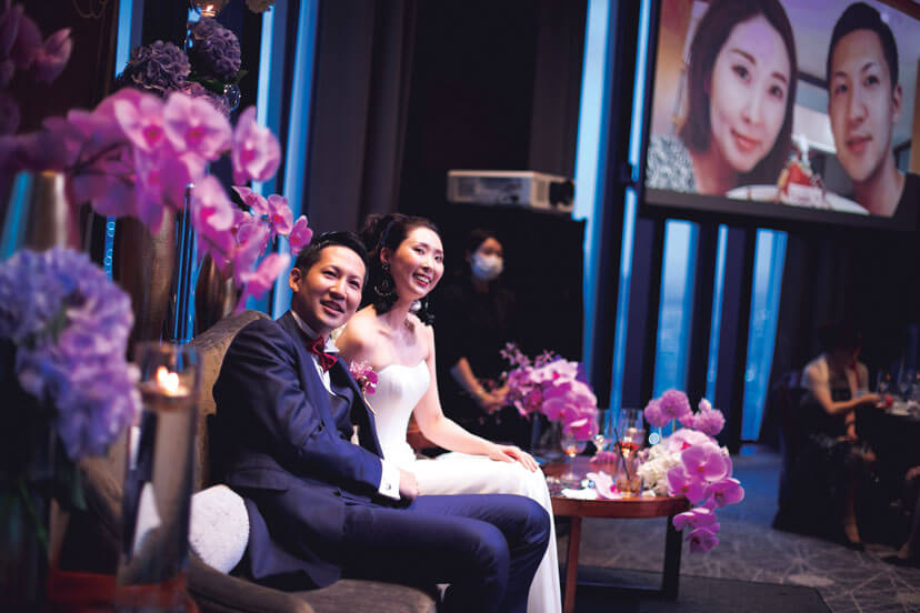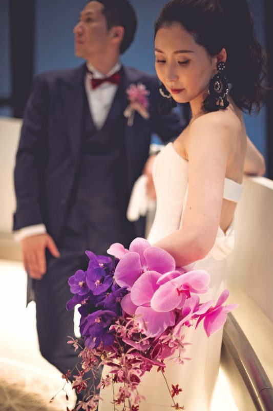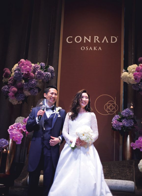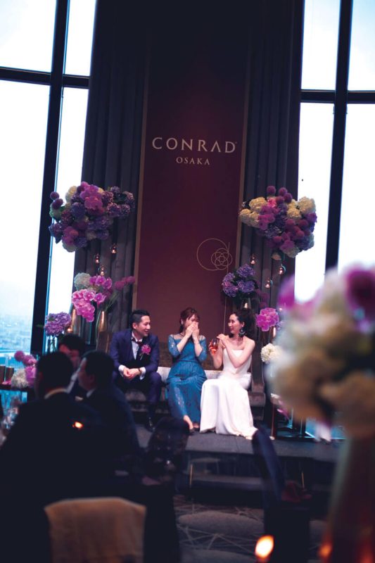 「コンラッド大阪」は友人が設計に携わるなど以前から思い入れがあった大好きなホテル。結婚が決まり迷わず式を申し込んだ。コンセプトは「大人スタイリッシュ」。新郎新婦もゲストも「年齢は全員アラサー以上」とあって大人の感性を満足させる披露パーティをプランニング。会場装飾はコンラッドのブランドカラーである紫を基調に、ピンクの胡蝶蘭や紫陽花をアレンジしてラグジュアリーな空間をコーディネート。おもてなしの料理には、フォアグラや雲丹などの好物のほか、出身地の食材を使ったテーラーメイドメニューを。音楽や演出も厳選し、ゆったり贅沢な時間を満喫してもらえるようこだわった。ゲストからは「装花がすごい!」「料理が美味しかった!」と期待以上に好評で、シャンパンタワーやプロジェクションマッピングなど個性的な試みも、ふたりらしさを印象付ける演出となった。当日、印象に残ったのは再会を喜ぶ友人たちのうれしそうな笑顔。コロナ禍でも諦めずに結婚式をして本当によかった!と、集まってくれたゲストへの感謝の念を新たにした。