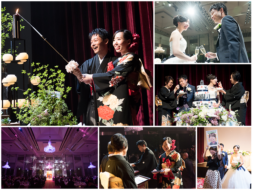 バカラのシャンデリアが煌めく「ボールルーム」での披露宴。「Ladies and Gentleman・・・」飛行機のアナウンスで幕を開けたパーティは、総料理長と打ち合わせをして決めたオリジナルメニューでおもてなし。披露宴の後半では、ふたりは華やかな和装にお色直しをして再入場。広い空間を利用したシャンデリアグラデーションや、ゲストからのサプライズ余興もあり、ふたりもゲストも感動に包まれる1日となった。